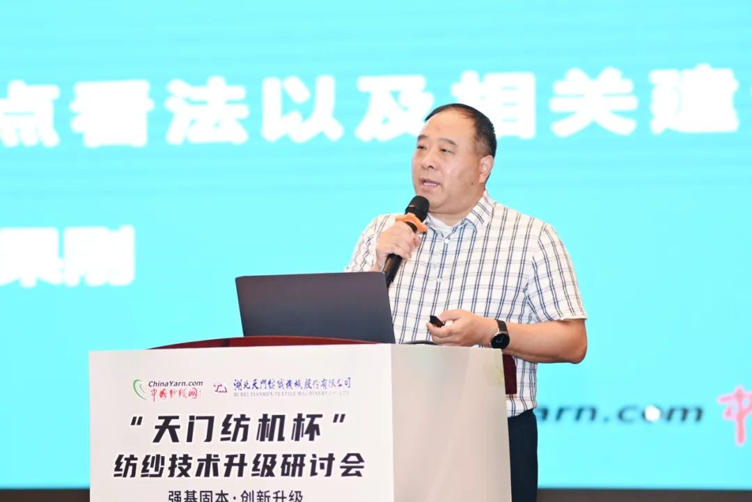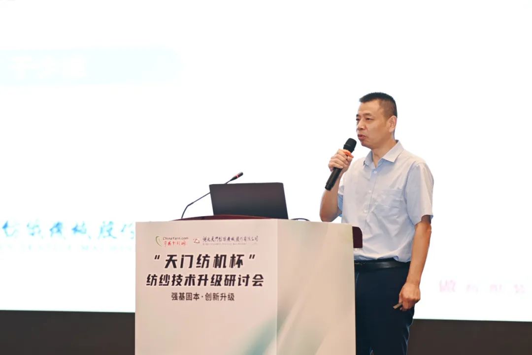 天門紡機(jī)總經(jīng)理焦倫進(jìn)向蒞臨會議的領(lǐng)導(dǎo)、嘉賓及長期關(guān)心支持天門紡機(jī)發(fā)展的各界同仁朋友表達(dá)了誠摯的謝意,他表示,天門紡機(jī)“生產(chǎn)制造柔性化、倉儲物流自動化、信息管理現(xiàn)代化”的5G+智慧工廠項(xiàng)目正在不斷向前推進(jìn),我們將通過自身的數(shù)字化轉(zhuǎn)型與智能化改造,為紡織企業(yè)數(shù)字化轉(zhuǎn)型和智能化改造持續(xù)提供裝備基礎(chǔ)。并作了題為《并條機(jī)的創(chuàng)新與應(yīng)用助力紡企高質(zhì)量發(fā)展》的專題報(bào)告。他交流了天門紡機(jī)堅(jiān)定不移走“專精特新”之路的工作經(jīng)驗(yàn),分享了勻整控制、在線監(jiān)控、5G+物聯(lián)網(wǎng)、自動熱交換降溫系統(tǒng)等技術(shù)創(chuàng)新成果。