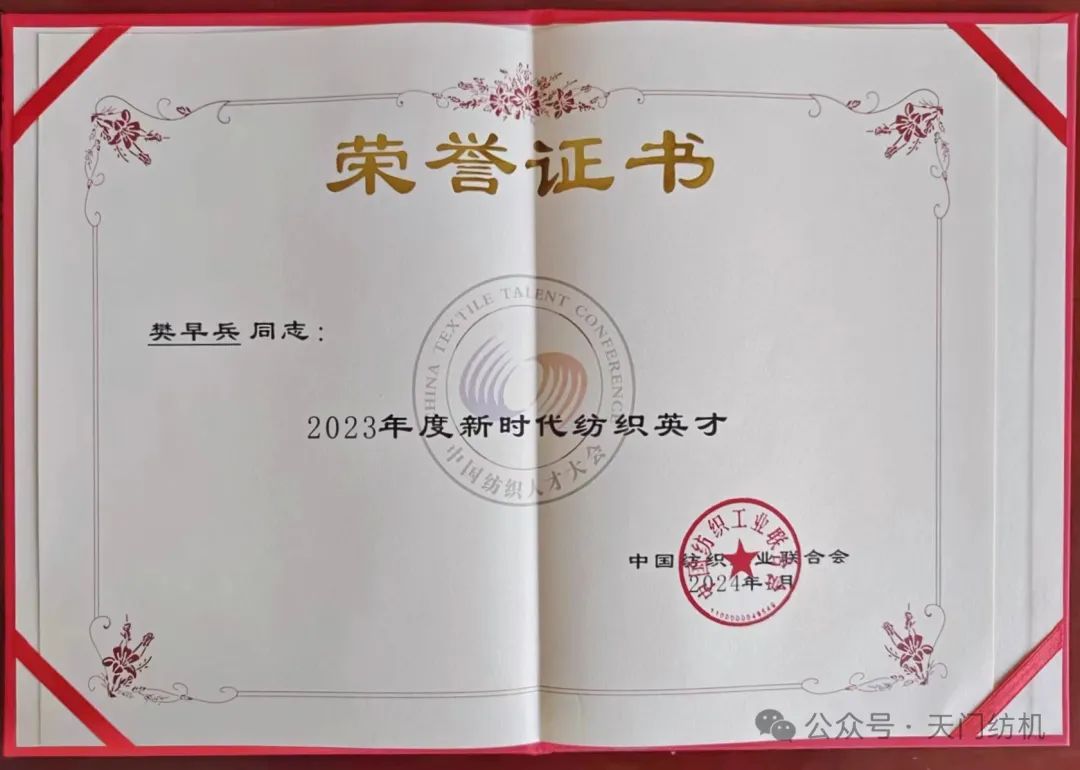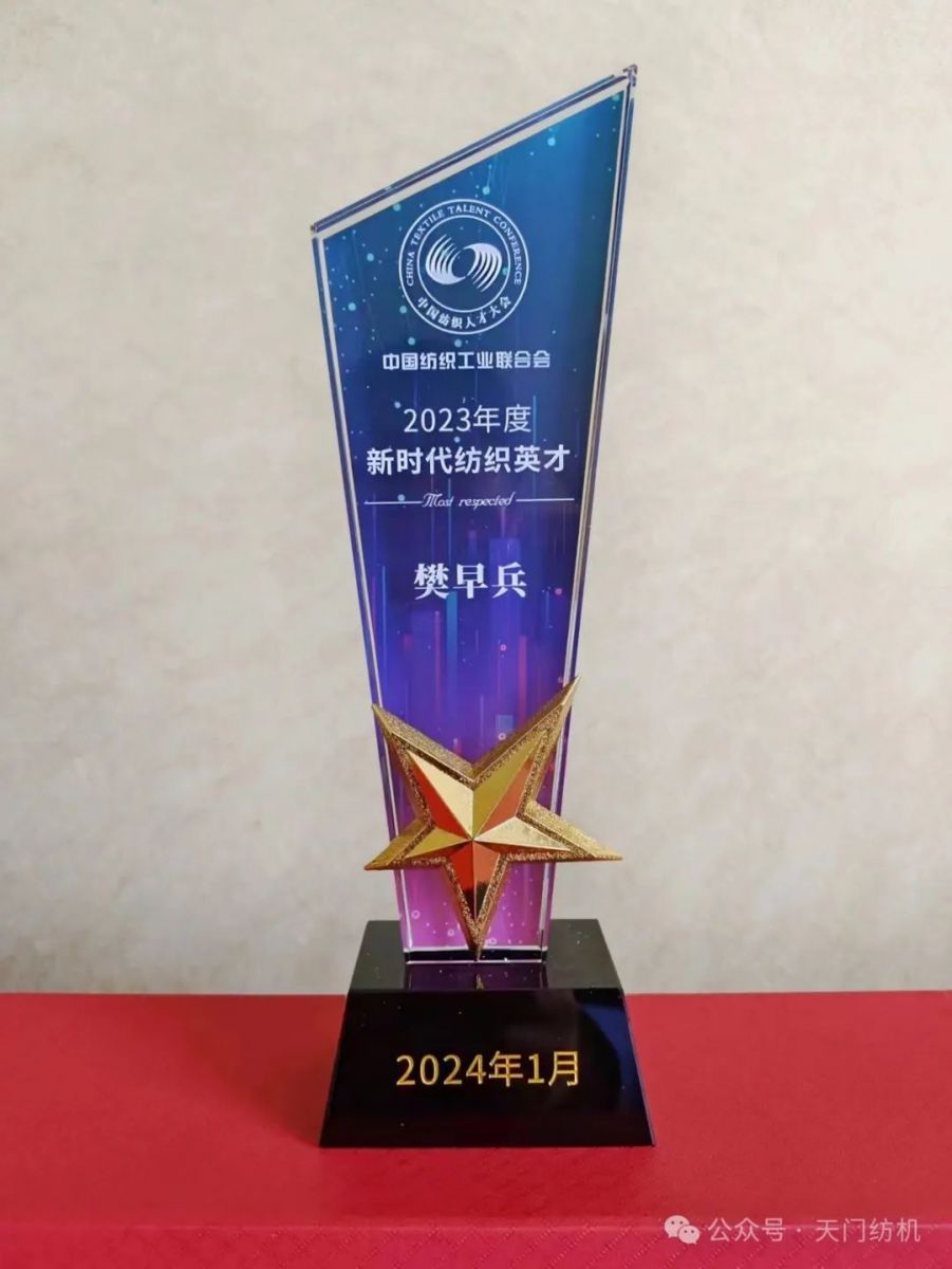 2024年1月16日,樊早兵同志在全國人大會(huì)議中心參加“2023年中國紡織人才大會(huì)”,受到中紡聯(lián)表彰,獲得“2023年度新時(shí)代紡織英才”獎(jiǎng)牌和榮譽(yù)證書。