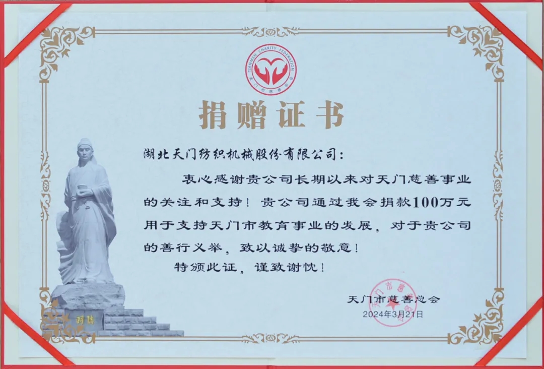 2024年3月21日,天門紡機(jī)董事長(zhǎng)沈方勇出席在天門市盧市鎮(zhèn)盧家口中學(xué)舉行的天門慈善總會(huì)“紅燭教育基金”成立暨首捐儀式,同天門市慈善總會(huì)、教育局三方簽訂了《天門市慈善總會(huì)“紅燭教育基金”協(xié)議書(shū)》,并現(xiàn)場(chǎng)捐贈(zèng)100萬(wàn)元,用于獎(jiǎng)勵(lì)盧市鎮(zhèn)優(yōu)秀教師和幫扶困難教師等公益活動(dòng),助力盧市鎮(zhèn)教育高質(zhì)量發(fā)展。天門市人民政府副市長(zhǎng)古玉麗,天門市民政局局長(zhǎng)、市慈善總會(huì)會(huì)長(zhǎng)謝金才,天門市教育局局長(zhǎng)劉華陽(yáng),天門市慈善總會(huì)秘書(shū)長(zhǎng)李貴清,盧市鎮(zhèn)宣傳統(tǒng)戰(zhàn)委員劉恒超以及盧市鎮(zhèn)部分教師代表等參加首捐儀式。盧市鎮(zhèn)黨委書(shū)記趙君波主持儀式。