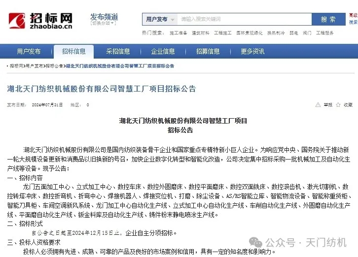 近日,天門紡機(jī)對外發(fā)布設(shè)備招標(biāo)公告,正式啟動(dòng)“智慧工廠”項(xiàng)目新一輪設(shè)備采購計(jì)劃。