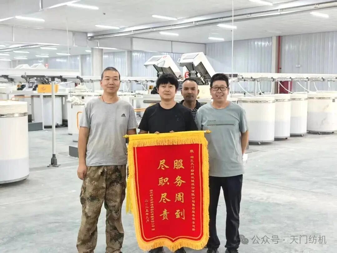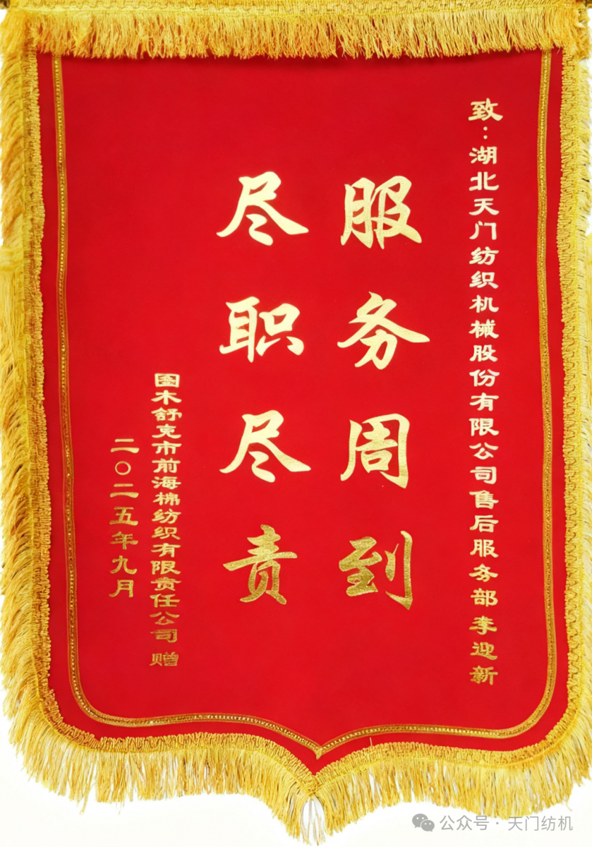 “服務(wù)周到,盡職盡責(zé)”,這是天門紡機(jī)新疆客戶圖木舒克市前海棉紡織有限責(zé)任公司送給90后售后服務(wù)工程師李迎新的錦旗贈(zèng)言。短短八個(gè)字,既是肯定,又是褒揚(yáng)。